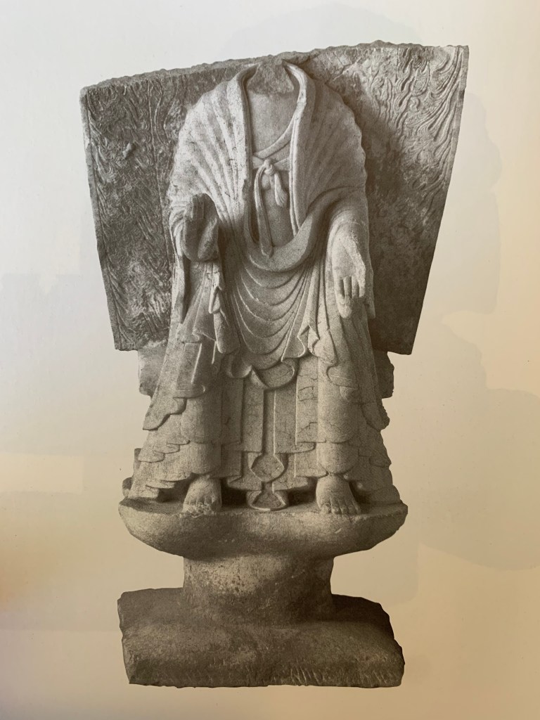 [Twitter, 1/26/23] MBOTD: Wang Nüren 王女仁, who inscribed an image on her parents’ behalf in 543 during the Eastern Wei. Put that way, it seems unsurprising, but what’s interesting is that the image itself had been commissioned 23 years earlier, in 520 during the Northern Wei. Here it is, with classic late N. Wei drapery. If you had to date it by style to either 520 or 543, it would very obviously be the former. It was found in the famous hoard at Xiudesi in Quyang 曲陽修德寺, Hebei. This image is from 李靜傑、田軍,定州白石佛像 (2019) p. 130: