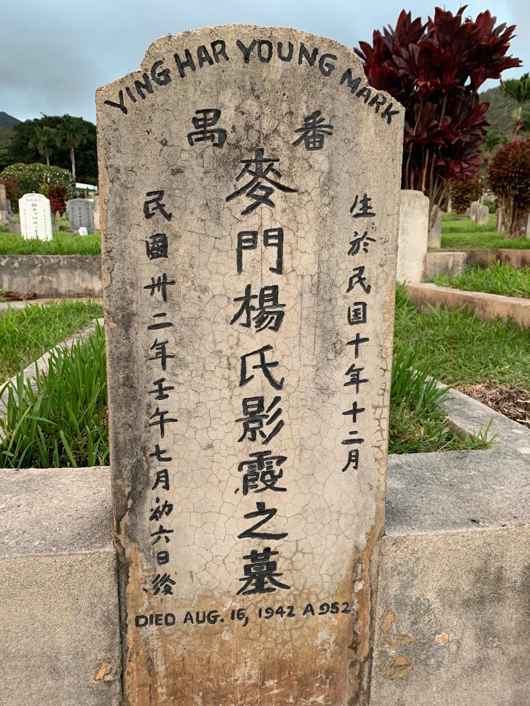 Here, for comparison, is a tombstone from 1942, from the graveyard near my house. Mrs Mark 麥, of Panyu county in Canton, was born Young Ying Har 楊影霞 and here she is named as “Mrs Mark, born into the Young family, named Ying Har” 麥門楊氏影霞.