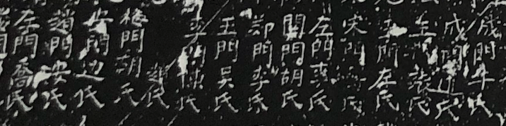 This snippet of a rubbing is blurry, but you can see that all the women are X 門 Y 氏, or “Née Y, of the X household,” X presumably being their husband’s surname. Hence 鄭門李氏, “Née Li, of the Zheng household,” or in a more modern idiom, “Madame Zheng, née Li.” I’m struck by this because it is an incredibly common formula seen on Chinese gravestones in Honolulu, including the ones in the cemetery I walk past on the way to and from work. But I’d never before this seen it in a medieval context. Chinese tombstones in Hawai’i are interesting as glimpses into 19th-century immigrant life, including the use of Suzhou numerals etc. But this is a convention I didn’t know was ancient. I’m not sure if it brings the past into the present, or the present into the past.