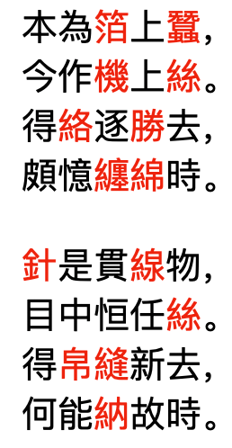 Just to show how shot through with the language of textiles both poems are, I marked the relevant characters in red. It’s worth recalling that sericulture was broadly understood as women’s work from a very early time.